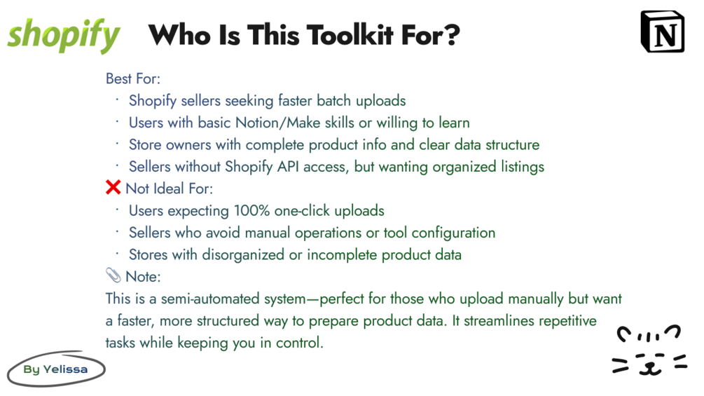 This is a semi-automated product listing tutorial system, designed for Shopify sellers who want to streamline their listing process using AI + Make + Notion. You’ll learn how to structure your data, connect tools, and generate product CSVs ready for upload.