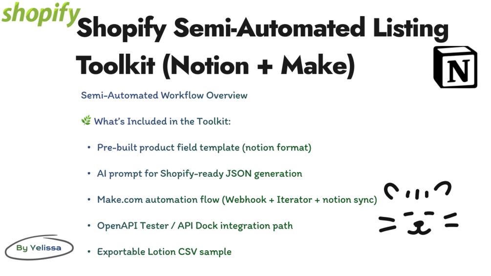 A no-code tutorial that teaches you how to build a semi-automated Shopify listing workflow using AI, Make, and Notion — with templates and step-by-step guidance.